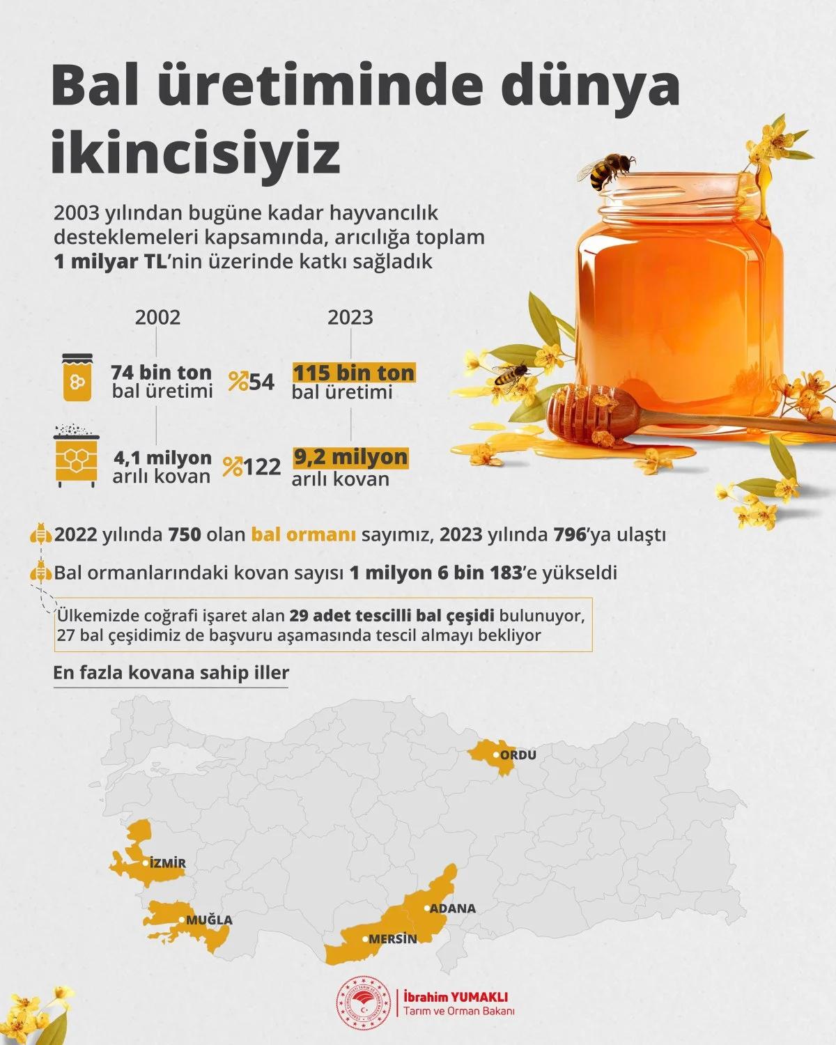 Minister of Agriculture and Forestry Ibrahim Yumakli shared information on honey production in the country on his social media page. Here are the main facts shared by Yumakly: - We are the second largest honey producer in the world- Due to its geographical location and biodiversity, Turkey accounts for 75% of the world's honey plant flora- Turkey produces 90% of all pine honey in the world- Since 2003, 1 billion liras have been spent to support beekeeping- In 2023, 115 thousand tons of honey were produced, and the number of hives reached 9.2 million- 29 varieties of honey with geographical indication have been registered in Turkey, and 27 varieties are awaiting registration at the application stage- The provinces producing the largest amount of honey are Ordu, Izmir, Mugla, Mersin and Adana