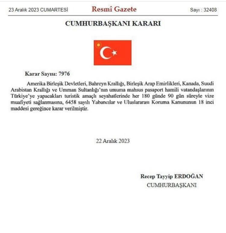 T rkiye Cumhurbaşkanı, ABD, Kanada, Bahreyn, BAE, Suudi Arabistan ve Umman vatandaşlarına vizesiz giriş izni vermek i in bir kararname imzaladı. Vizesiz d nem - altı ay boyunca 90 g n.